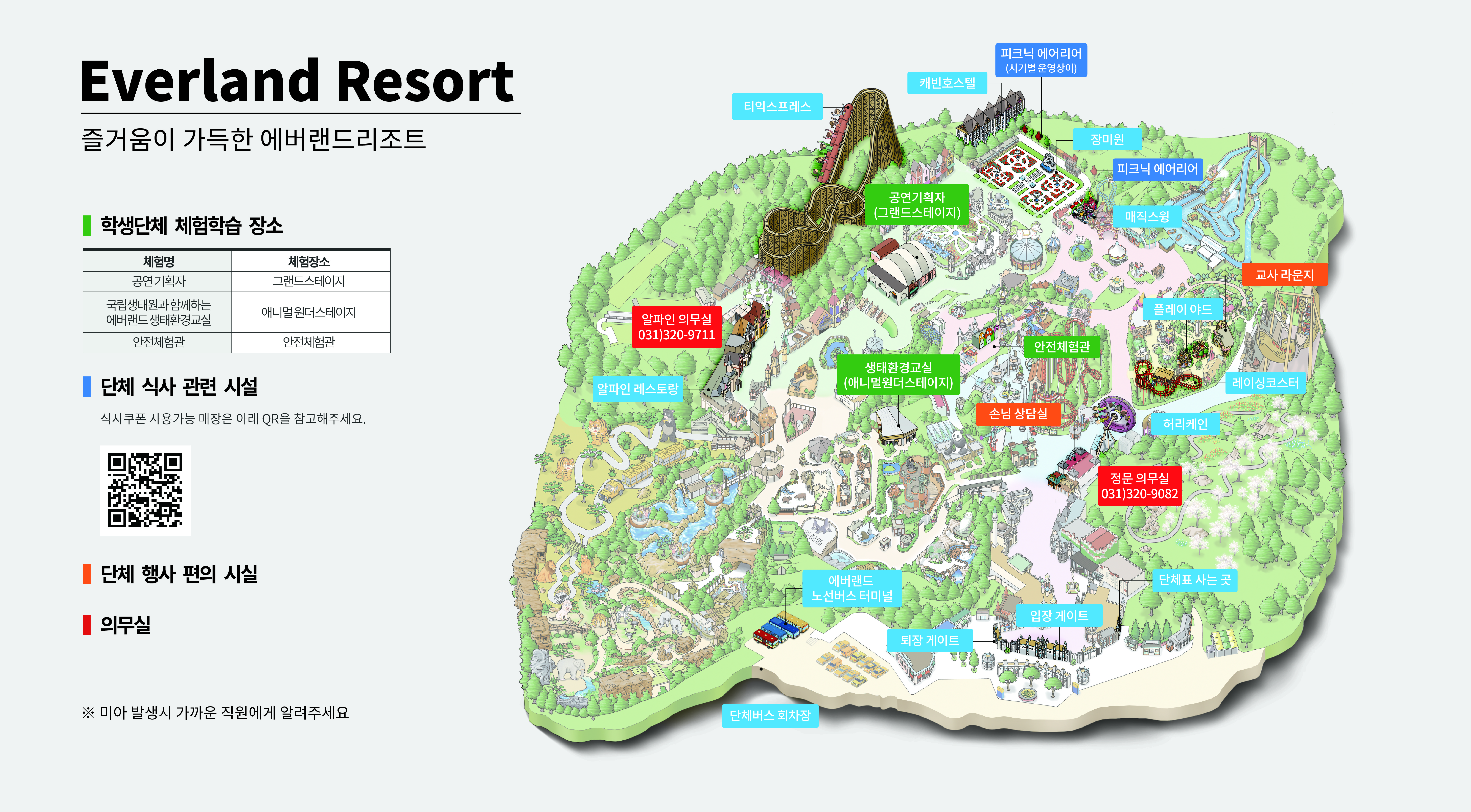 에버랜드는 서울에서 약 1시간 거리에 위치해 있으며, 다양한 대중교통으로 접근이 가능합니다. 2025년부터는 직통 고속버스 노선이 증설되어 더욱 편리해졌습니다. 주차장은 총 20,000대 수용 가능하며, 전기차 충전소도 완비되어 있습니다.